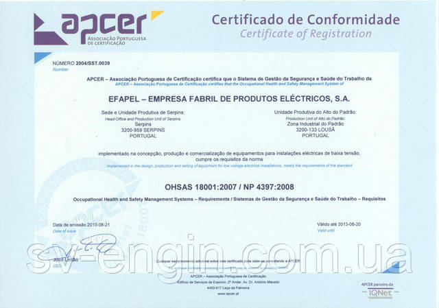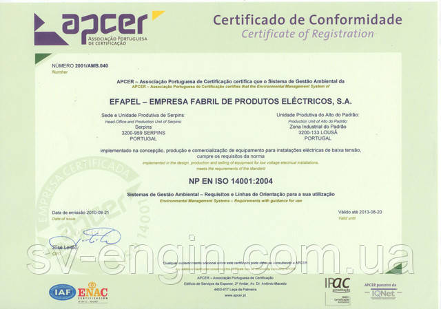 Вся продукція EFAPEL розробляється, виробляється й тестується в суворій відповідності до всіх застосованих стандартів, а також відповідає вимогам нормативів у кожній країні, у якій представлена. EFAPEL гарантує якість і безпеку продукції, забезпечуючи постійний нагляд за виробничим процесом і суворий внутрішній контроль якості.