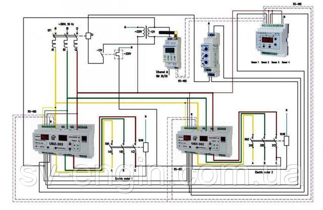 - Пристрій УБЗ-302 — універсальний блок захисту електродвигунів призначений для постійного контролю параметрів мережевої напруги, що діють значень фазних/лінійних струмів трифазного електрообладнання 380 В, 50 Гц і перевірки значення опору ізоляції електродвигунів.