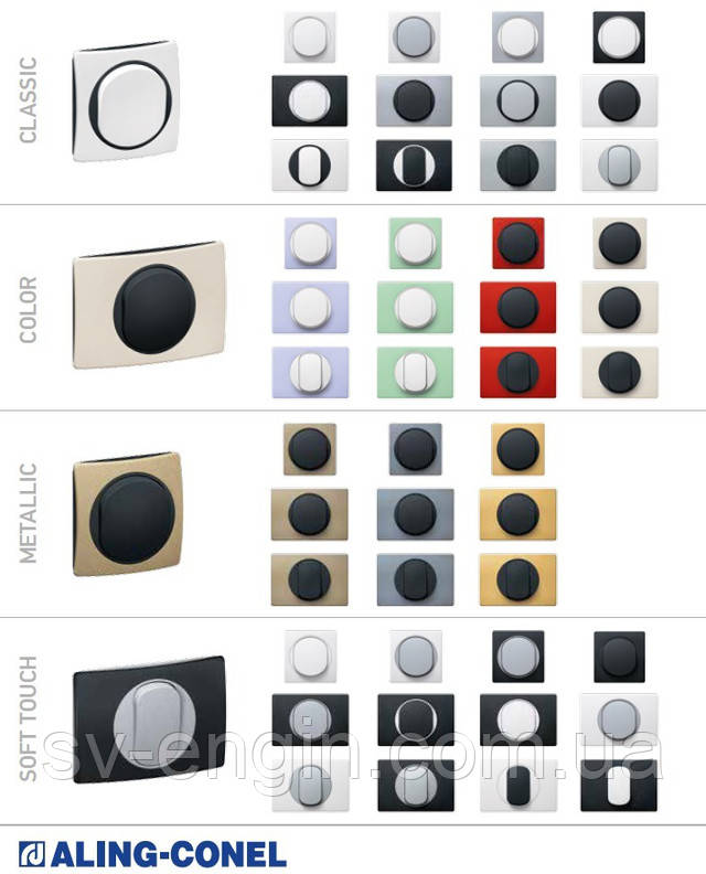 - серцевина (клавіша, центральна панель) - білий (CLASSIC) або чорні кольори: чорний глянцевий (CLASSIC), чорний матовий (SOFT TOUCH).. Можлива поставка під замовлення колір античне срібро (сірий).